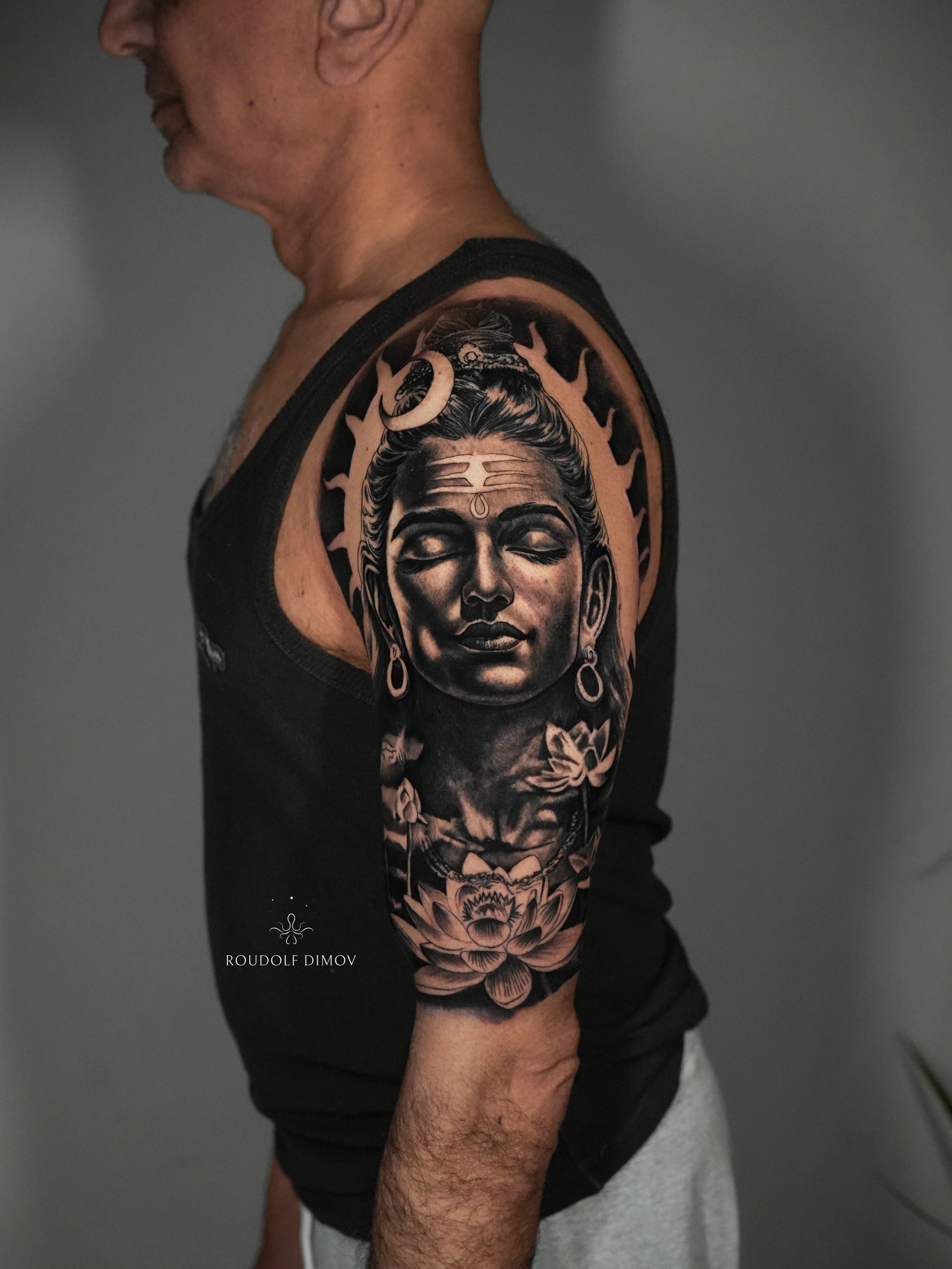 A black and grey realism tattoo aims to replicate real-life images — such as portraits, animals, statues, or cinematic scenes — using only shades of black ink diluted with water to create gradients and tones.
